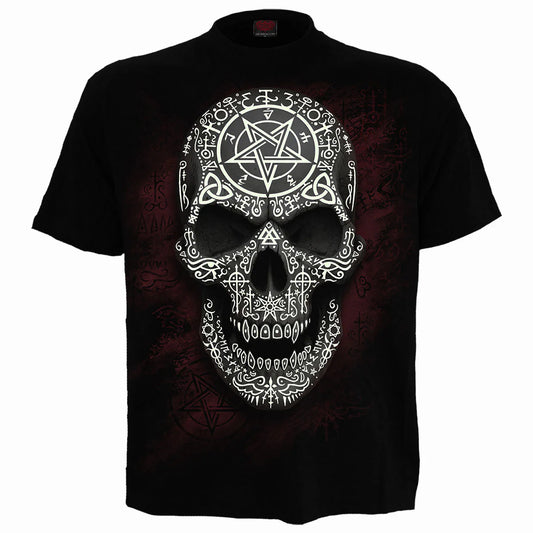GLOW IN THE DARK - SPIRAL - GOTHIC RUNES - FRONT PRINT T-SHIRT BLACK
