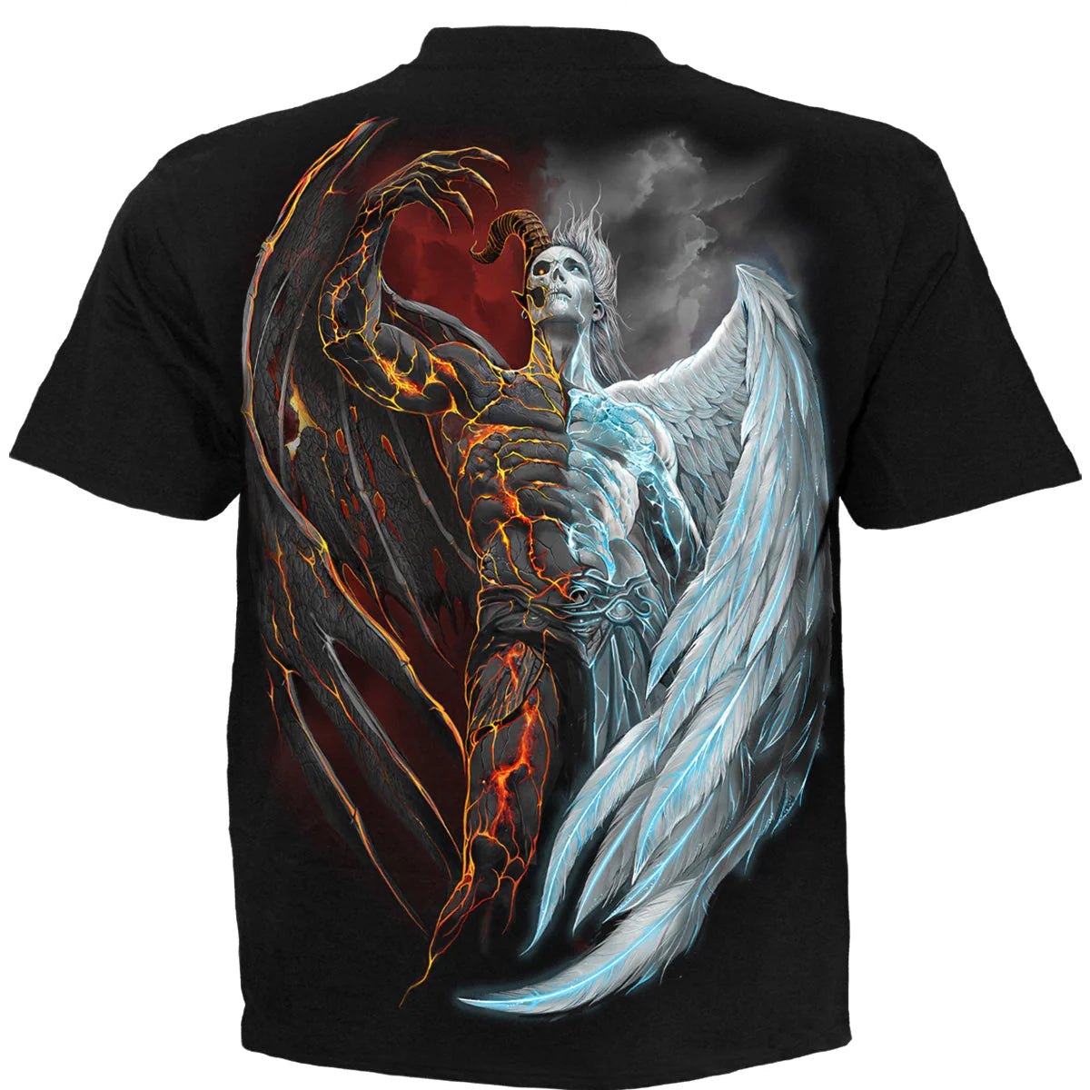 ✔ Striking Duality Design: Features a dramatic split-face graphic of an angelic and demonic figure, symbolizing the eternal struggle between light and darkness within the soul — a powerful gothic statement.