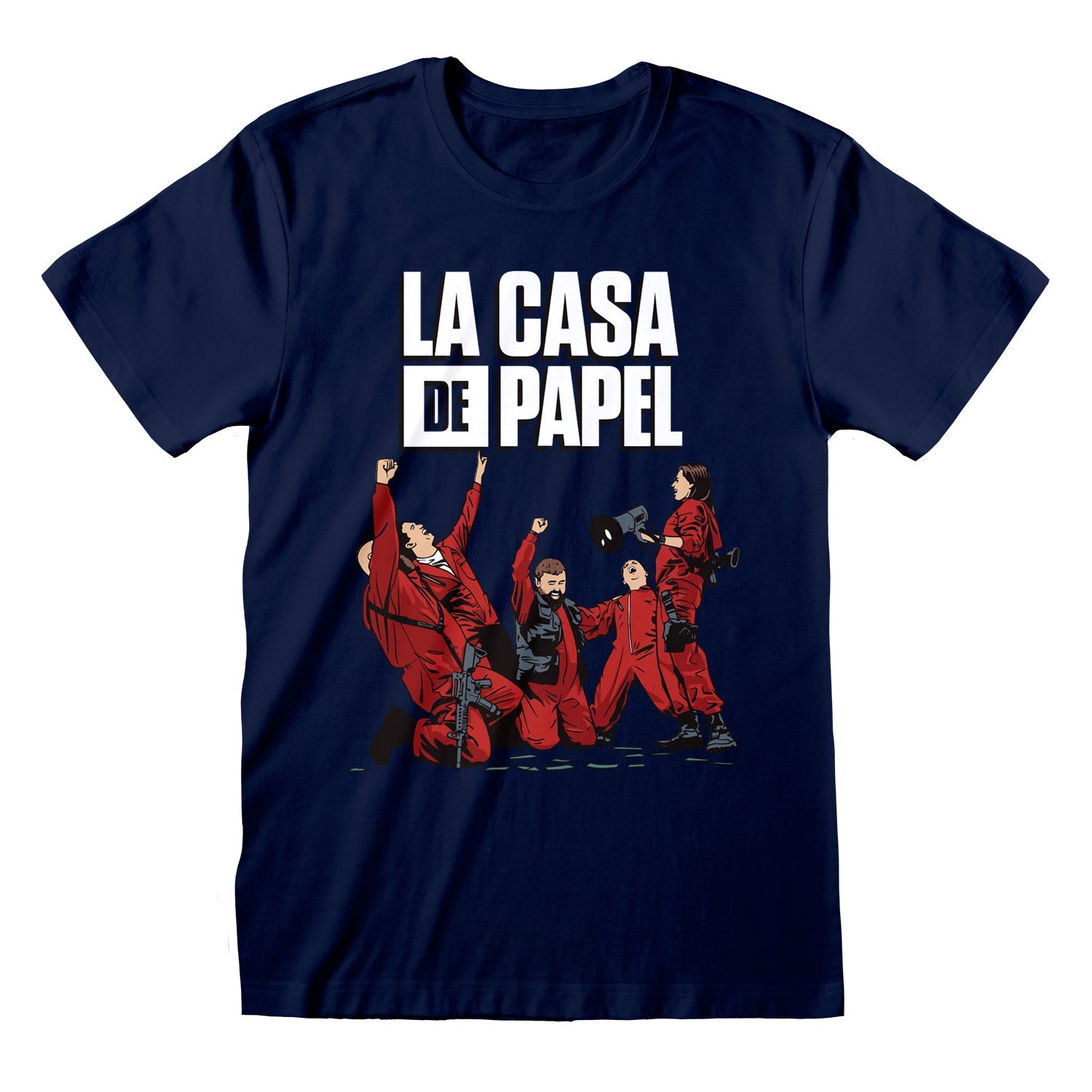 Officially Licensed La Casa De Papel merchandise. This T-shirt features an iconic design from the franchise, printed on a 100% cotton navy unisex T-shirt. 30% degrees wash