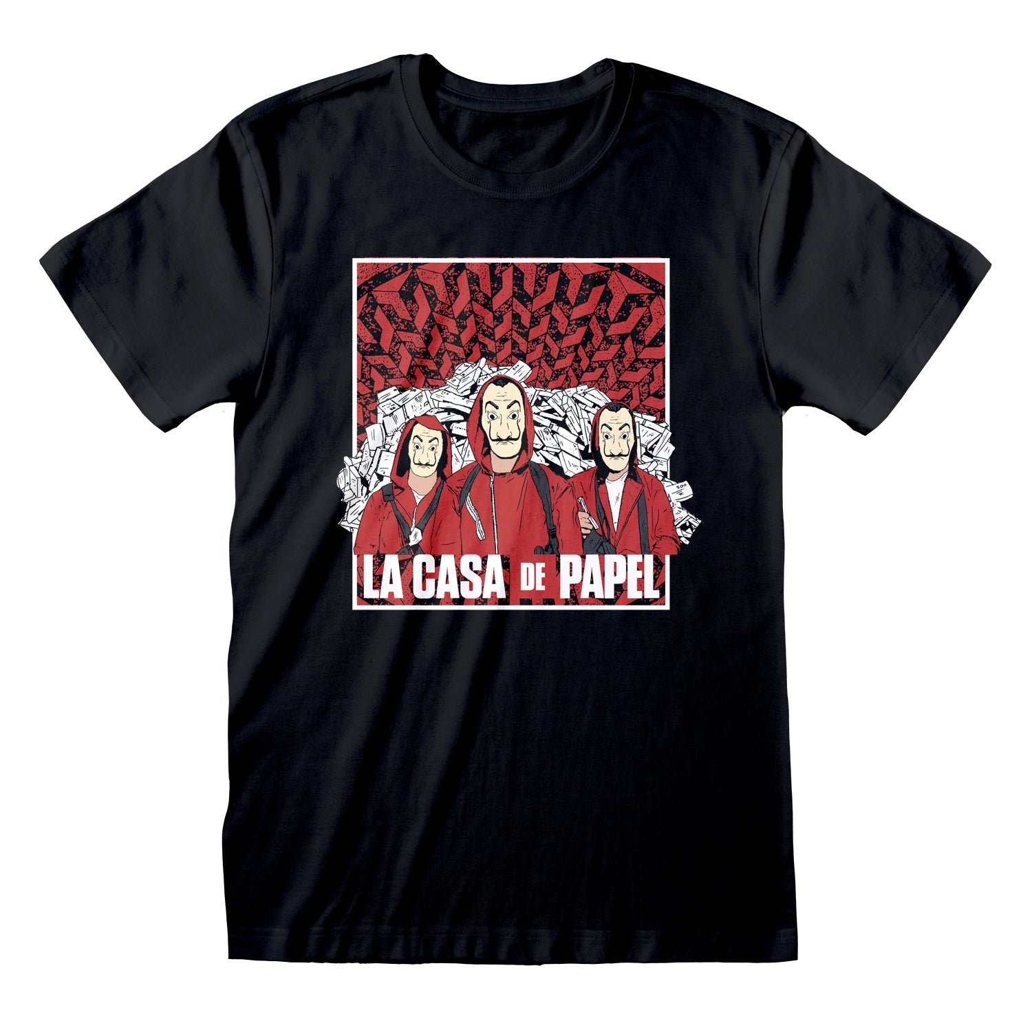 Officially Licensed La Casa De Papel merchandise. This T-shirt features an iconic design from the franchise, printed on a 100% cotton black unisex T-shirt. 30% degrees wash