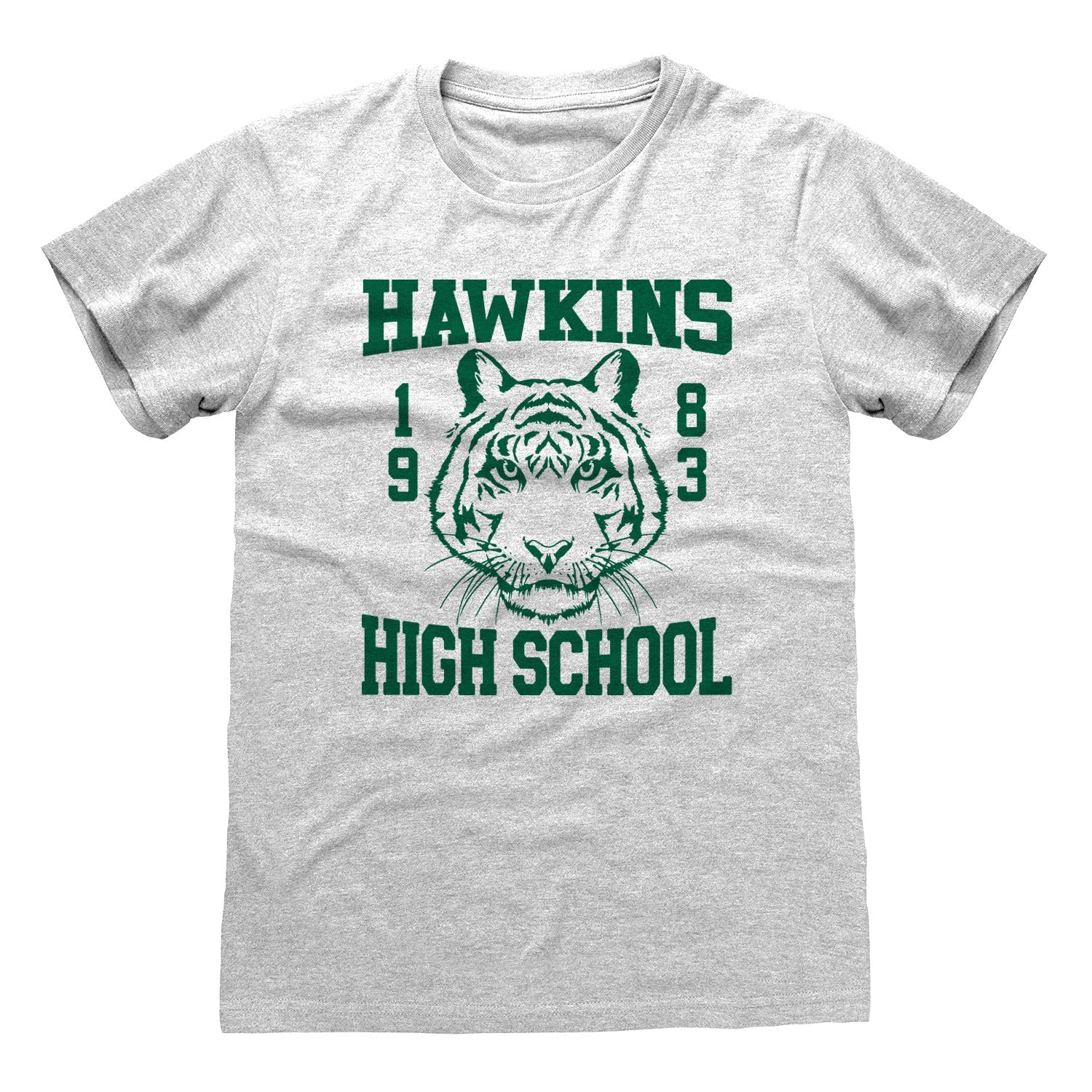- ✔ Bold Design: This T-shirt features the emblem of Hawkins High School from the Stranger Things series, set against a grey background.
